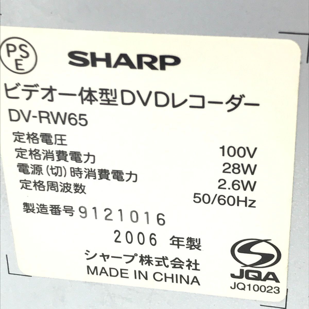 シャープ製のビデオ一体型DVDレコーダー、DV-RW65です。VHSビデオとDVDの再生・録画がこの一台で可能な複合機となります。製品ラベルに記載の通り、2006年製で、本体色はシルバーです。写真の手書きメモにもあるように、「傷や汚れあり」の新品となります。外観には経年による擦れや使用に伴う汚れが確認できますが、映像機器として基本的な動作は確認済みです。付属品は電源コードが直付けされており、RCAケーブル(赤白黄)が付属しています。リモコンや取扱説明書は付属しませんので、ご留意ください。
