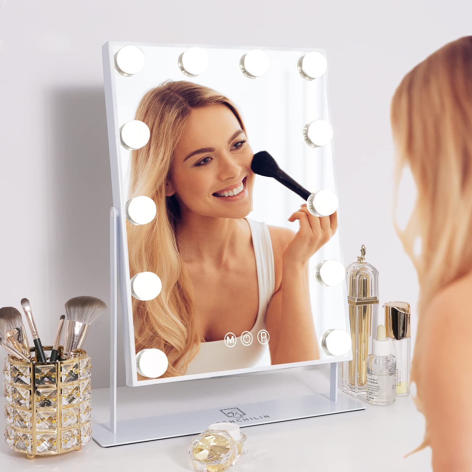 FENCHILIN 化粧鏡 女優ミラー 卓上鏡 卓上ミラー ハリウッドミラー 三色照明モード 明るさ調節可能 12個ハリウッドLED電球付き 10倍拡大鏡付き 360度回転 日本語取扱説明書付き(ホワイト)