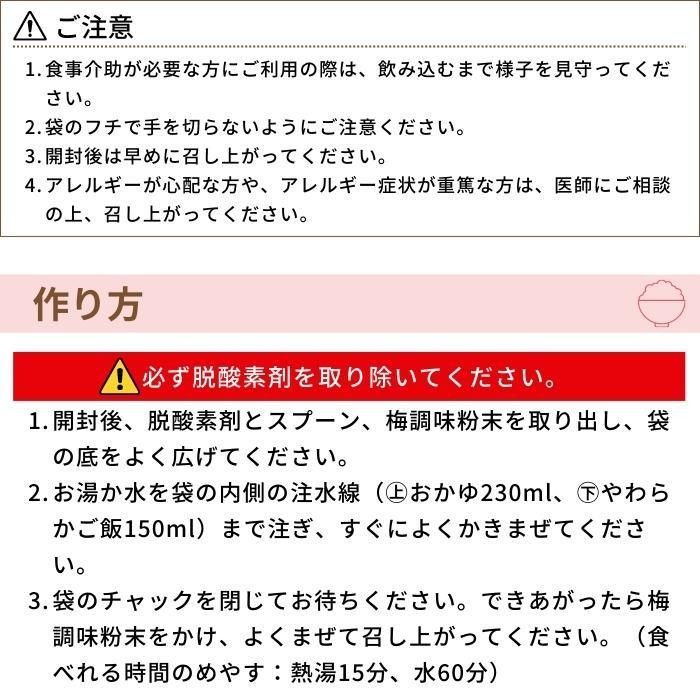 国産のうるち米を100%使用。おかゆとやわらかご飯、2通りの食べ方が可能です。梅調味粉末を最後に混ぜることで、梅の香りと味が一層引き立ちます。