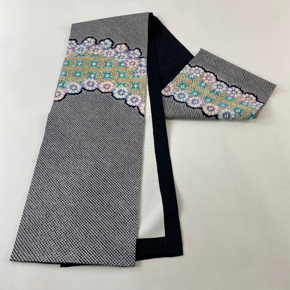 開き名古屋帯 花 幾何学 絞り 黒 正絹