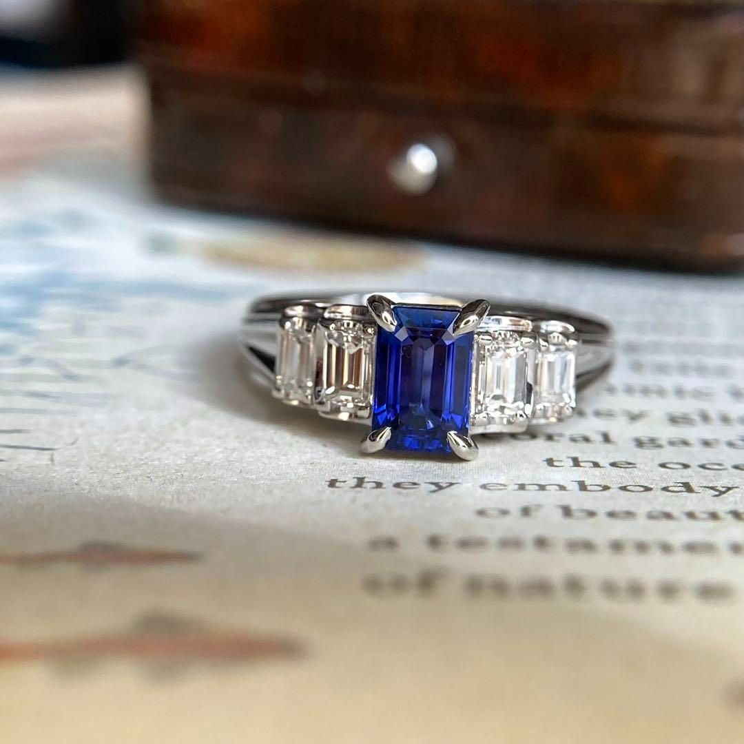 両脇には、輝きの際立つエメラルドカットのダイヤモンドを贅沢に配し、ロイヤルブルーの煌めきをより一層引き立てています。直線的なフォルムが、センターストーンの力強さと高貴な佇まいを際立たせ、全体に洗練された印象を与えます。