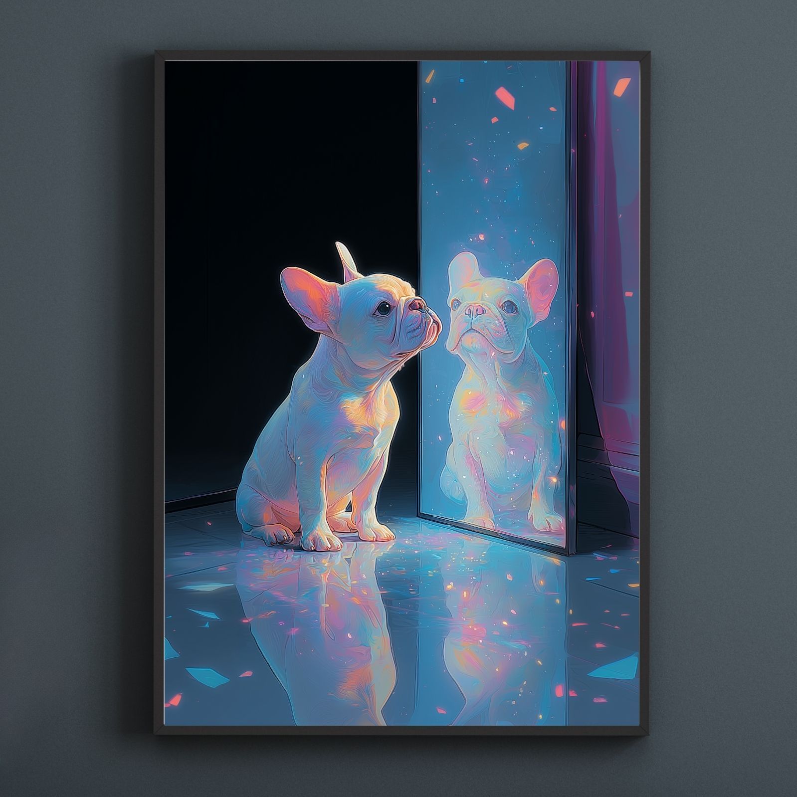 フレンチブルドッグ・フレブル犬がオーロラのような光に包まれて、幻想的な色彩が空間にやさしく溶け込み、見るたびに癒しを与えてくれるアートポスター作品です。