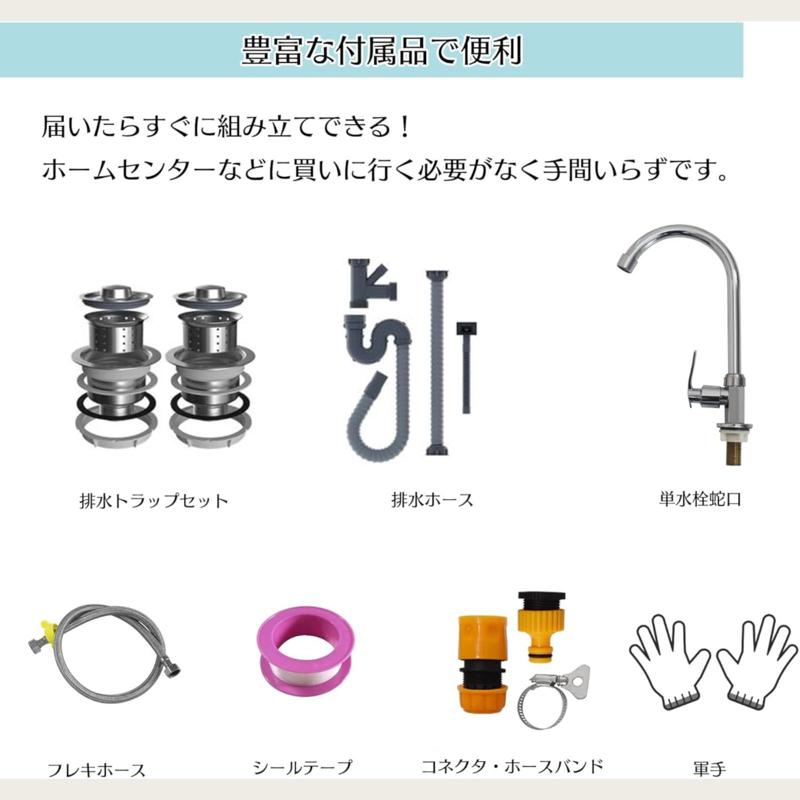 ※必要な付属品:本体、排水部品、単水栓部品、軍手、コネクタ・ホースバンド、アジャスター、説明書 は全て揃っています。