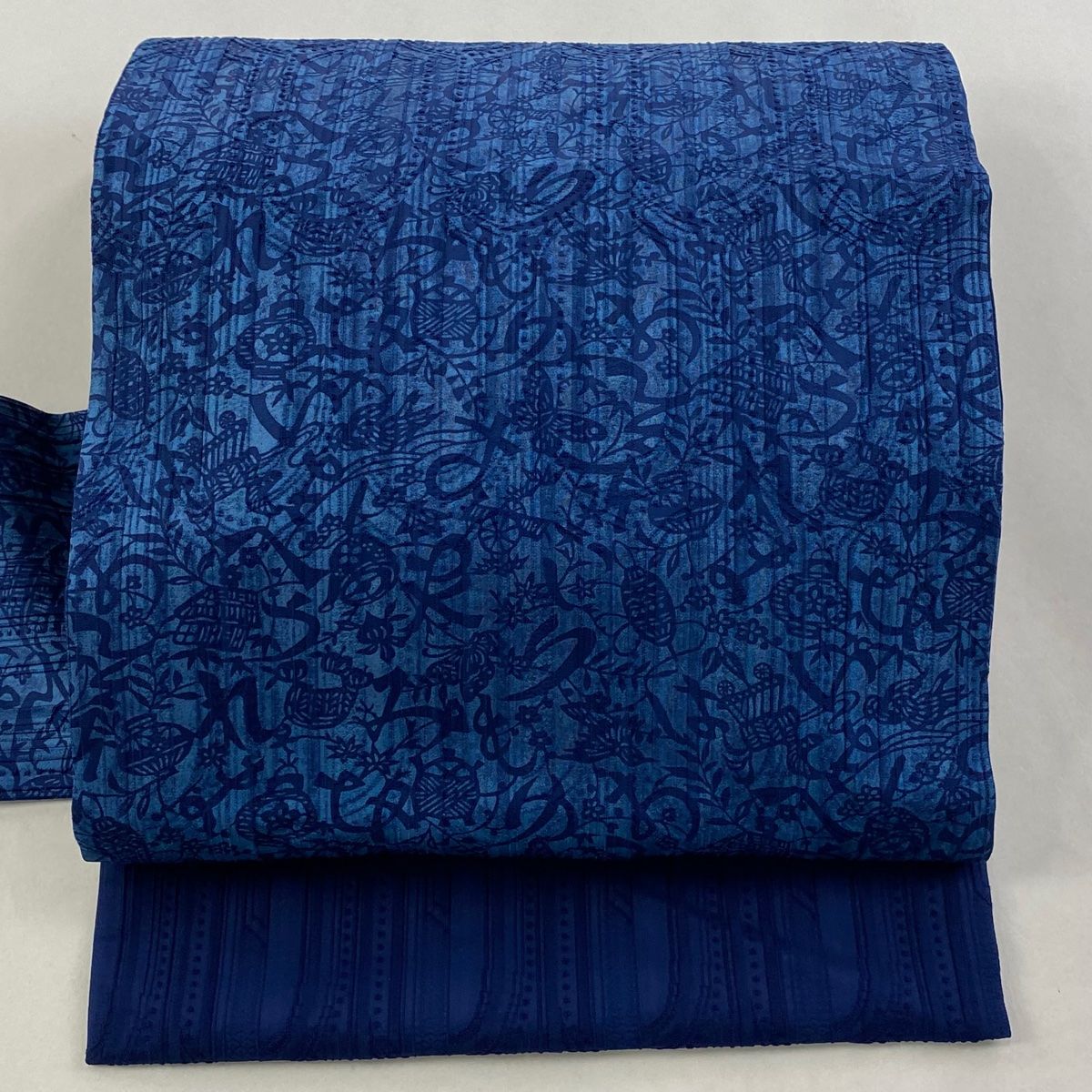 名古屋帯 秀品 落款 阿波藍型染 金子正 文字文 蝶 藍色 正絹