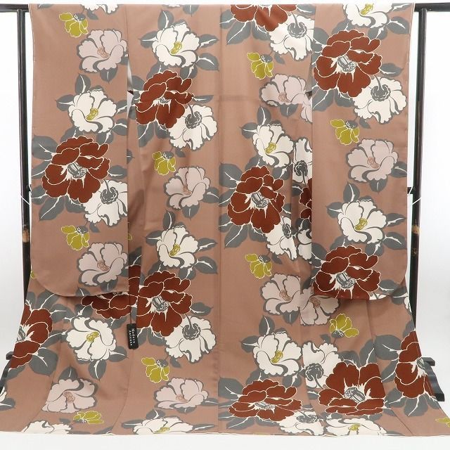 焦香色の生地に、大ぶりな椿が咲き誇るデザイン。くすみカラーの落ち着いた色合いが、懐かしさと今っぽさを絶妙に融合させ、大胆な柄なのに品格も忘れません。