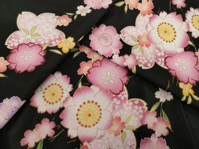 平和屋着物 小振袖 二尺袖 舞桜文 黒地 化繊 ck