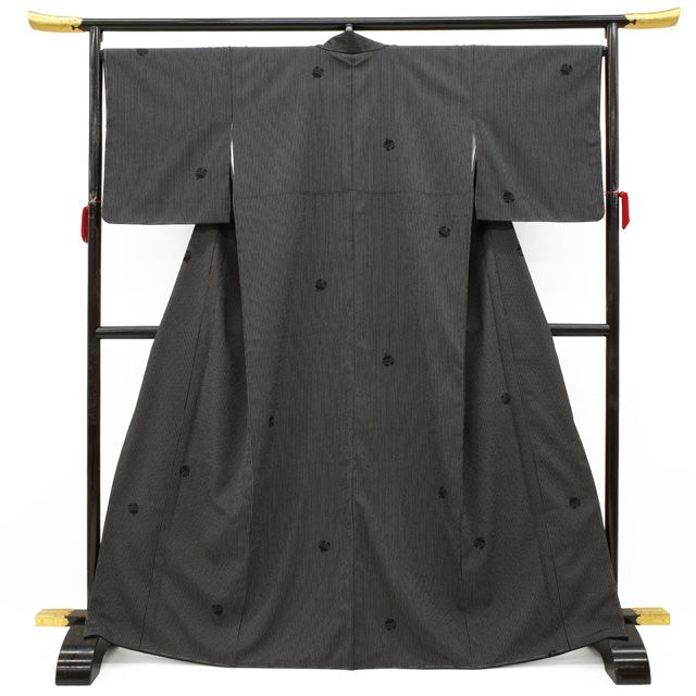 落ち着いた黒地に、細縞が全体に織り出され、さらに飛び柄で丸く愛らしい鈴の柄が黒で抜くように配された贅沢な逸品。