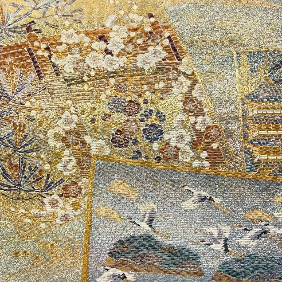 丸帯 加賀 百撰 色紙 枝梅 箔 水色 全通 正絹