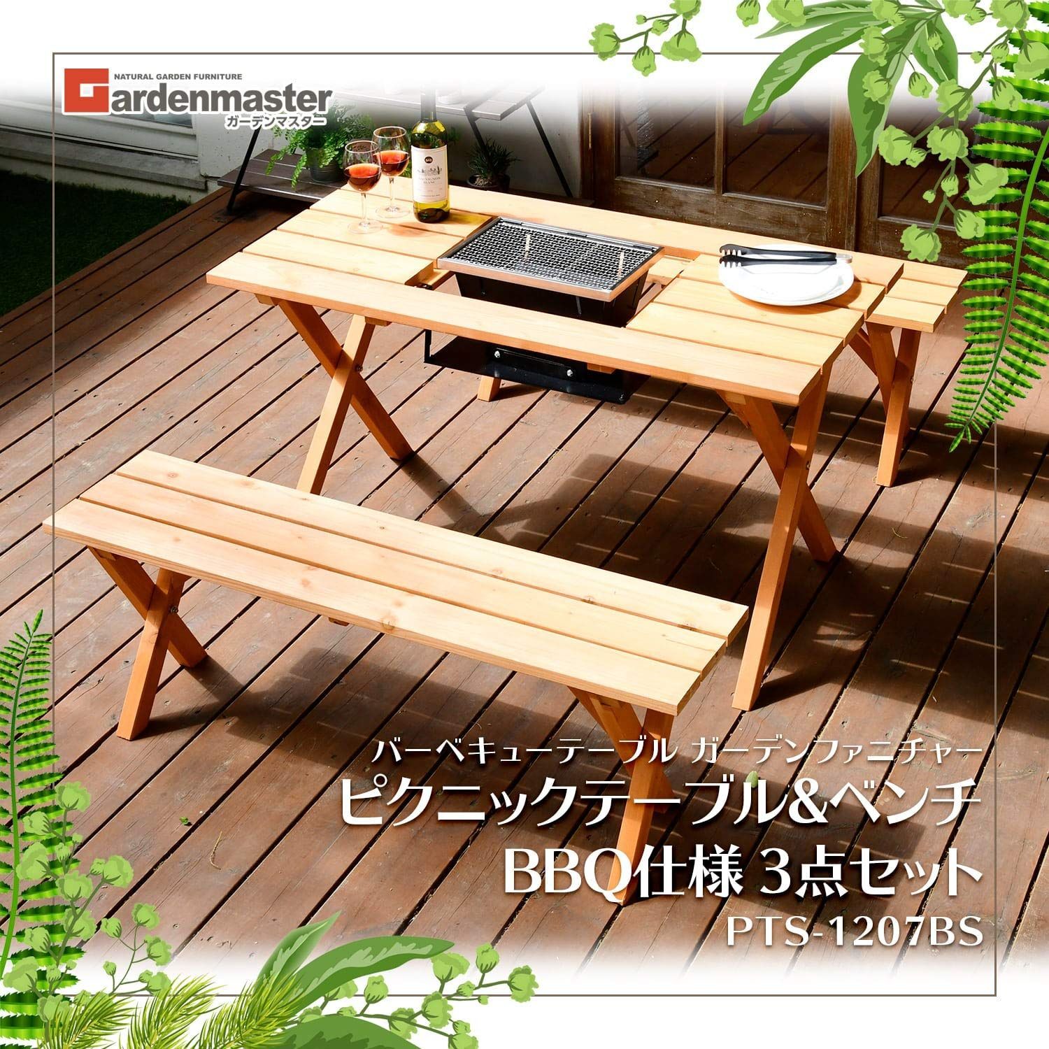お庭 ベランダ コンロ台付 パラソルホール付き テラス 天然木杉材 バルコニー テーブル1点-チェア2点セット 3点セット ガーデンマスター ガーデンテーブル-ベンチ PTS-1207 BS Gardenmaster