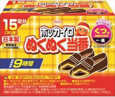 ぬくぬく当番シリーズのくつ用カイロ。くつに入れて使うタイプ。自社従来品に比べて温度の立ち上がりも早く、持続時間も9時間と長時間暖かさをキープします。色は靴になじみやすいよう黒色。