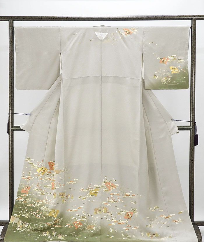 ライトグレー地に渋め草色の濃淡裾ぼかしとサーモンピンクや紫・草色などの多色や金箔・金駒で扇面四季花模様が柄付けされています。