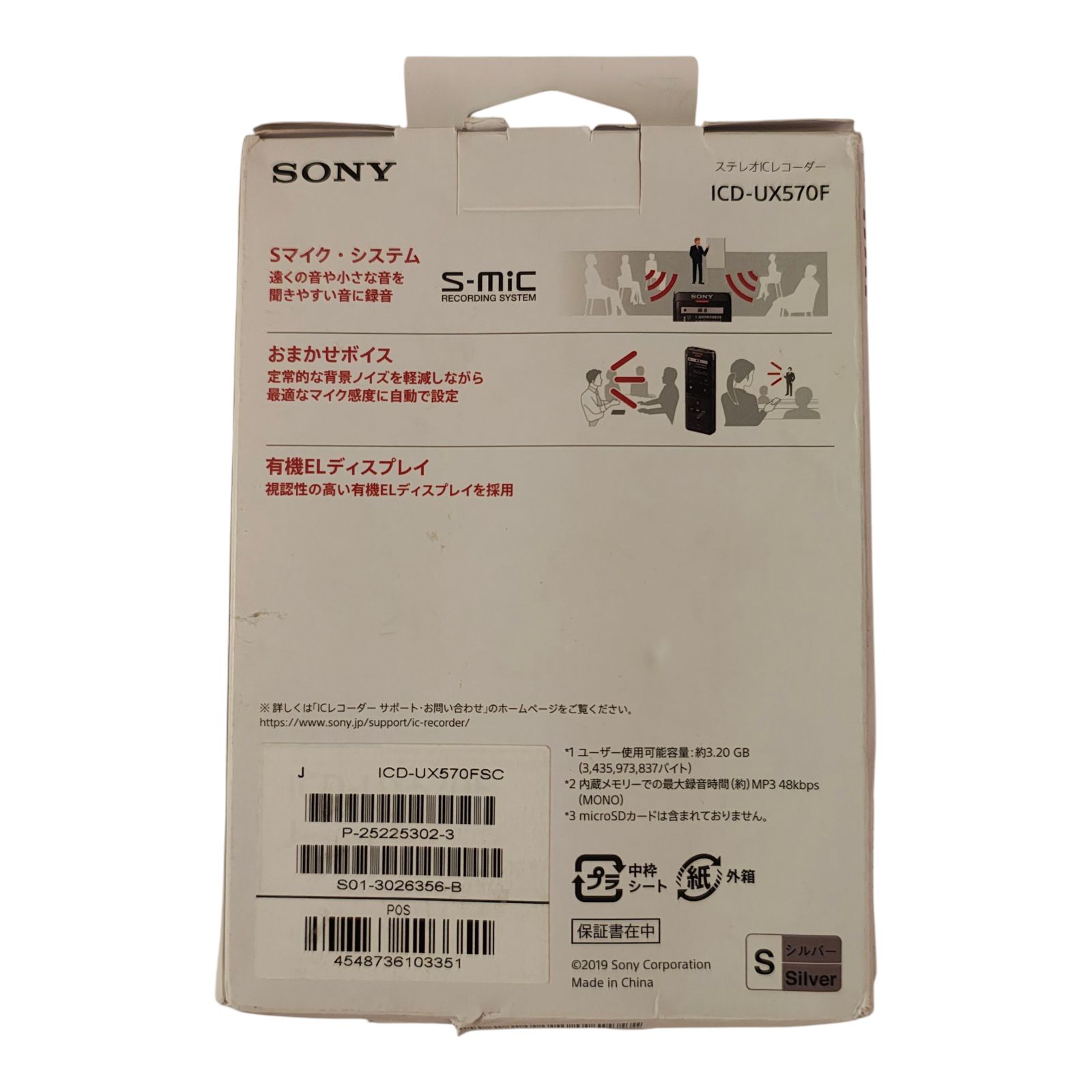 WJ 46 ソニー SONY ICレコーダー 4 GB 薄型 軽量 Sマイク システム 最大22時間連続使用 クリアボイス機能搭載 シルバー ICD-UX 570 F