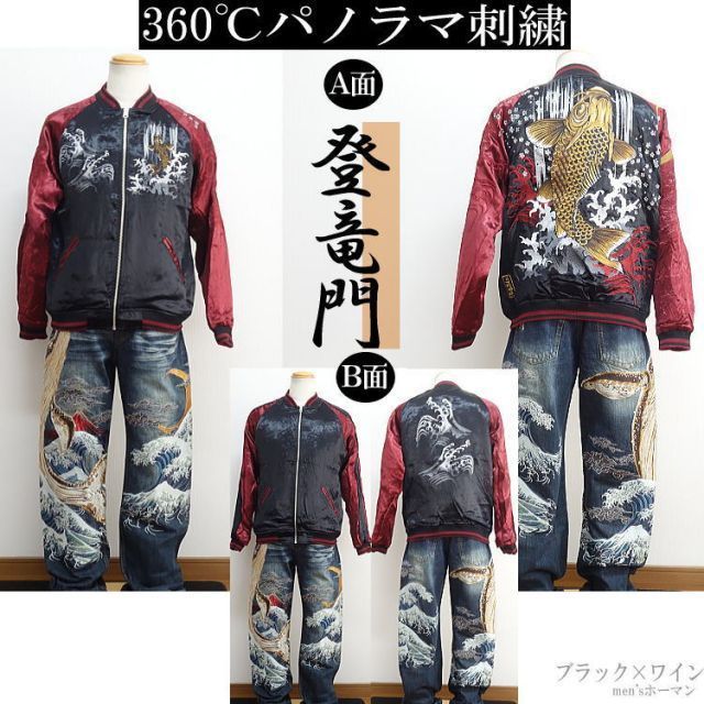 商品名:2022年春夏秋物新作【ビッグ有】絡繰魂/カラクリ魂/からくり魂 粋【送料無料】登竜門 総刺繍 リバーシブル 光沢 ブルゾン/スカジャン 黒×袖ワイン M/L/XL/XXL【smtb-k】【ky】父の日【YDKG-k】メンズ ギフト【RCP】222017