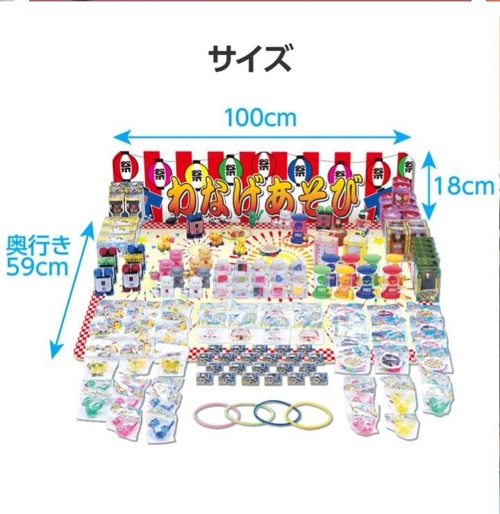 輪投げリングやディスプレイ台に加えて,おもちゃの景品が200個もついてるので,イベント運営の手間を大幅に削減します