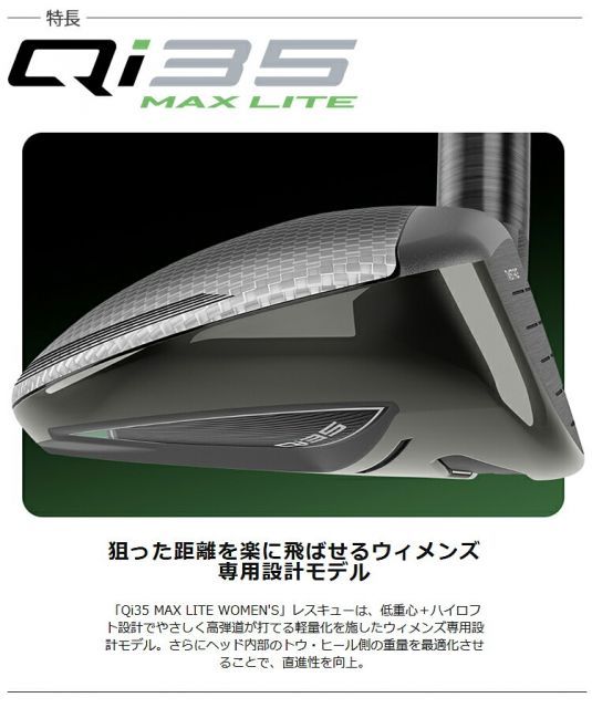 前作(Qi10)よりも軽量化を図り、低重心とハイロフトでやさしく高弾道が打てる女性専用設計モデル。ヘッド内部のトウ・ヒール側の重量を最適化させることで直進性を向上しています。