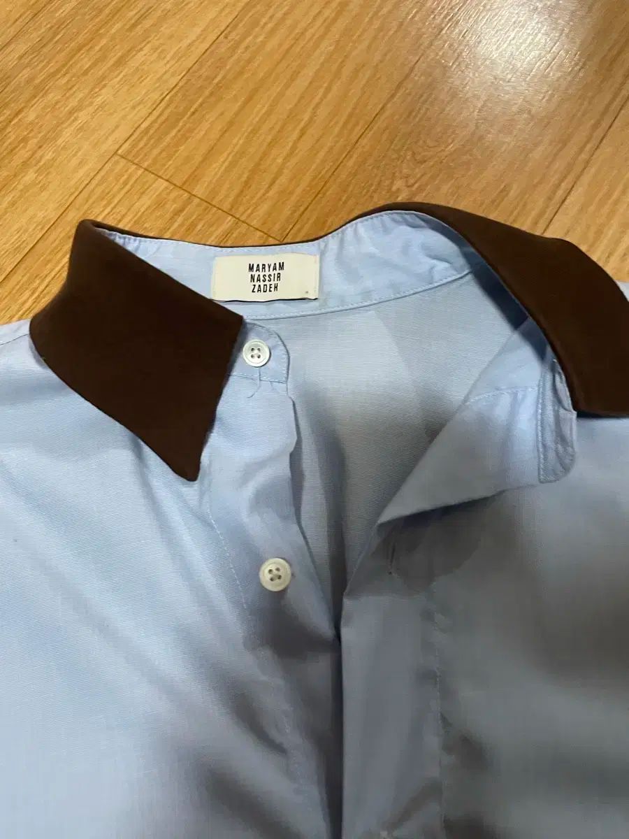 マリヤム・ナスィル・ザデーの半袖シャツ Sサイズです。明るいスカイブルーのバターンにブラウンでPOINTが入っています。ユニークなデザインで目に留まり、きれいです。裾に若干の汚れあり。コメントがなければ、すぐにお支払い手続きをお願いします!